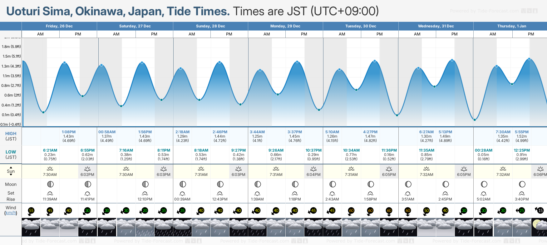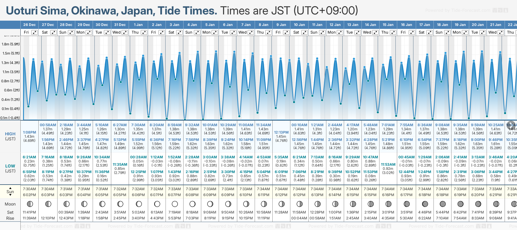 Tide Times are JST (UTC +9.0hrs). Last Spring High Tide at Uoturi Sima was on Tue 23 Dec (height: 1.65m 5.4ft). Next high Spring Tide at Uoturi Sima will be on Tue 06 Jan (height: 1.63m 5.3ft).