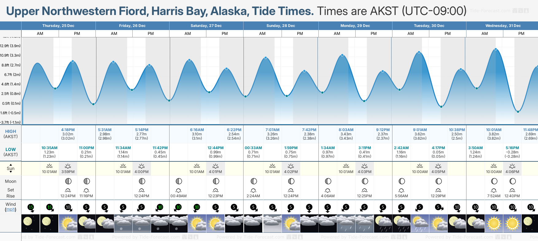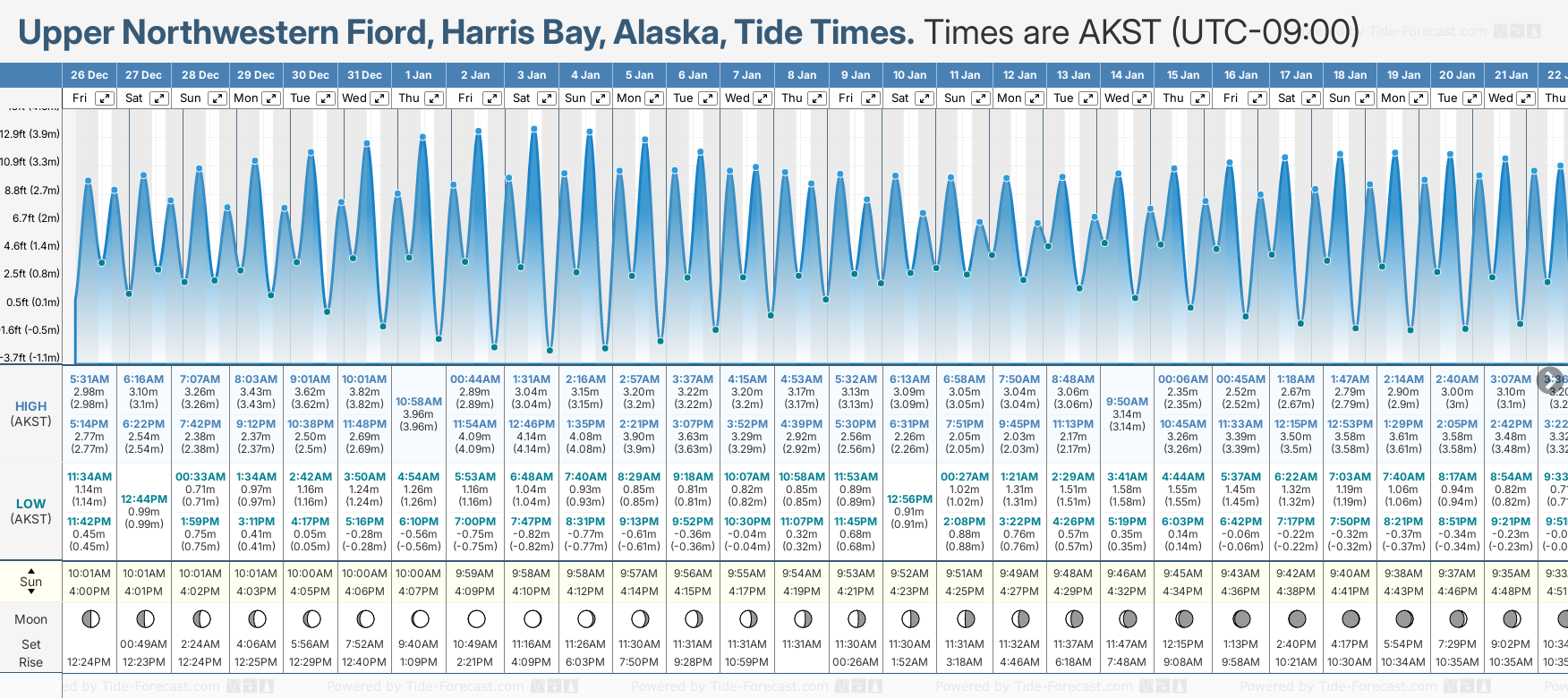 Tide Times are AKST (UTC -9.0hrs). Last Spring High Tide at Upper Northwestern Fiord, Harris Bay was on Sat 20 Dec (height: 3.62m 11.9ft). Next high Spring Tide at Upper Northwestern Fiord, Harris Bay will be on Sat 03 Jan (height: 4.14m 13.6ft).