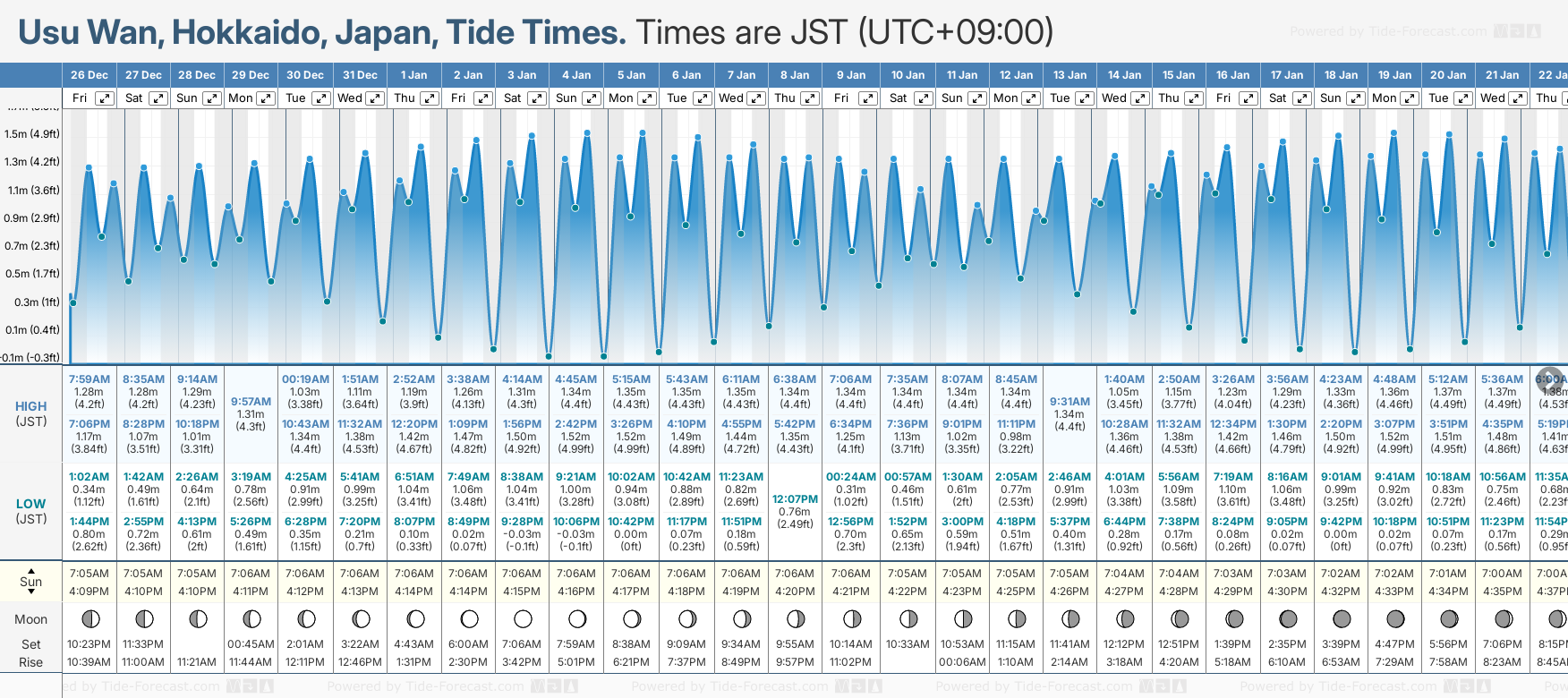 Tide Times are JST (UTC +9.0hrs). Last Spring High Tide at Usu Wan was on Mon 22 Dec (height: 1.53m 5.0ft). Next high Spring Tide at Usu Wan will be on Sun 04 Jan (height: 1.52m 5.0ft).