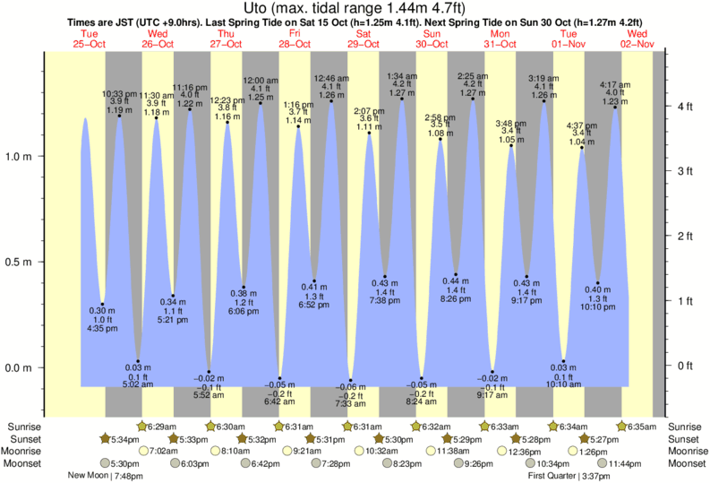 Tide Times are JST (UTC +9.0hrs). Last Spring High Tide at Uto was on Wed 17 Dec (height: 1.23m 4.0ft). Next high Spring Tide at Uto will be on Wed 24 Dec (height: 1.28m 4.2ft).