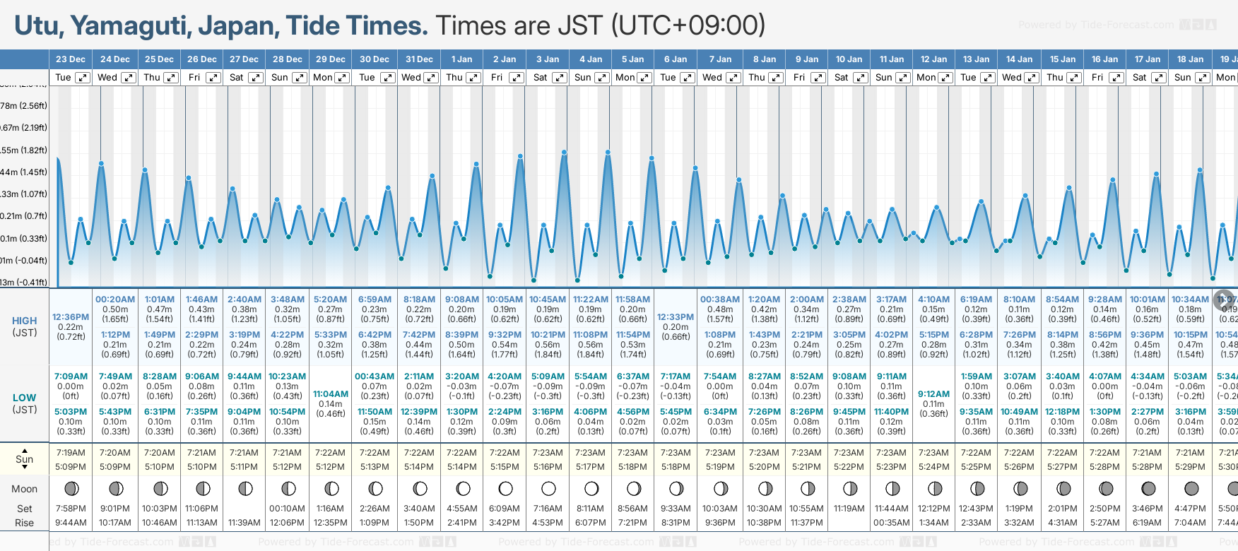 Tide Times are JST (UTC +9.0hrs). Last Spring High Tide at Utu was on Sun 21 Dec (height: 0.53m 1.7ft). Next high Spring Tide at Utu will be on Sun 04 Jan (height: 0.56m 1.8ft).
