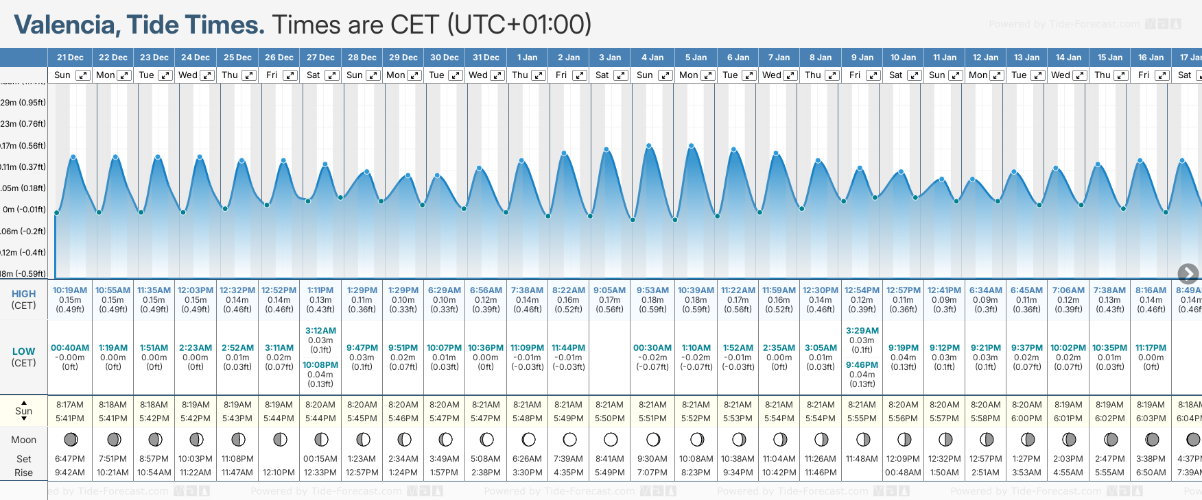 December and January Tide charts for Valencia: The tide charts below show the height, time and date of high and low tides for the next 30 days.