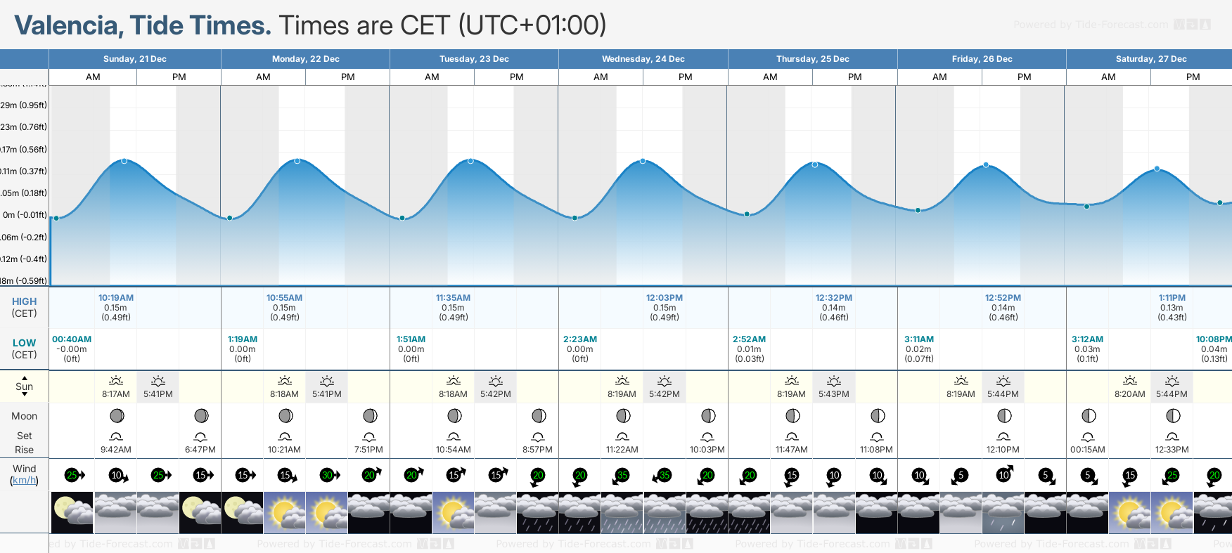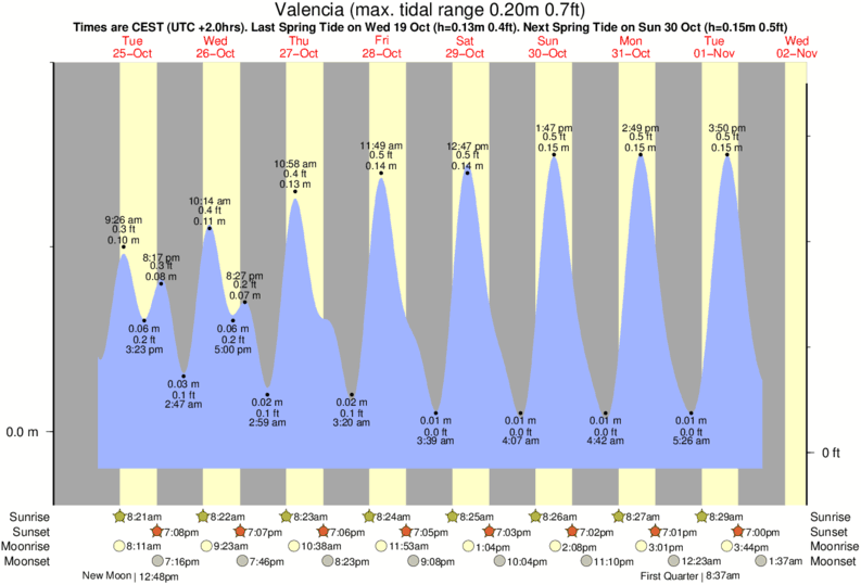 Tide Times are CET (UTC +1.0hrs). Last Spring High Tide at Valencia was on Sun 07 Dec (height: 0.18m 0.6ft). Next high Spring Tide at Valencia will be on Sun 21 Dec (height: 0.15m 0.5ft).