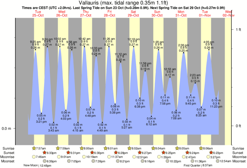 Tide Times are CET (UTC +1.0hrs). Last Spring High Tide at Vallauris was on Mon 08 Dec (height: 0.31m 1.0ft). Next high Spring Tide at Vallauris will be on Mon 22 Dec (height: 0.28m 0.9ft).