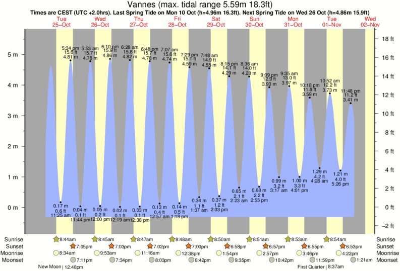 Tide Times are CET (UTC +1.0hrs). Last Spring High Tide at Vannes was on Sat 06 Dec (height: 4.94m 16.2ft). Next high Spring Tide at Vannes will be on Mon 22 Dec (height: 4.35m 14.3ft).