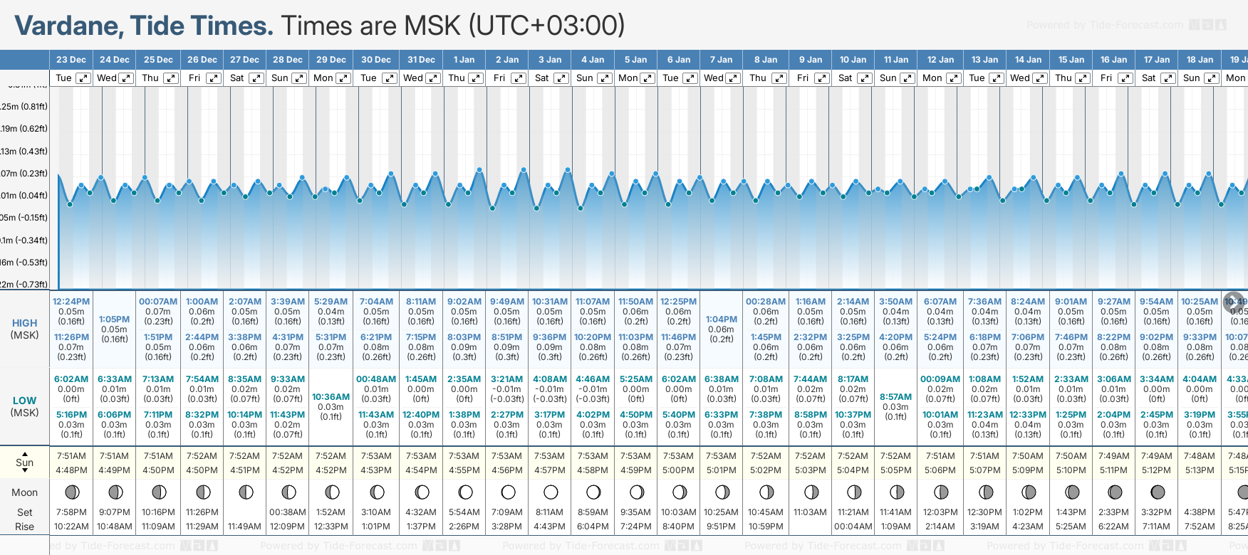 Tide Times are MSK (UTC +3.0hrs). Last Spring High Tide at Vardane was on Mon 22 Dec (height: 0.08m 0.3ft). Next high Spring Tide at Vardane will be on Thu 01 Jan (height: 0.09m 0.3ft).