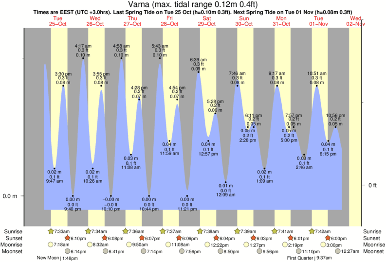 Tide Times are EET (UTC +2.0hrs). Last Spring High Tide at Varna was on Wed 17 Dec (height: 0.09m 0.3ft). Next high Spring Tide at Varna will be on Wed 24 Dec (height: 0.09m 0.3ft).