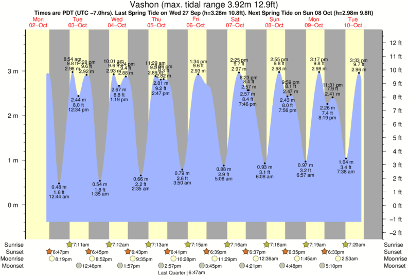 Tide Times are PST (UTC -8.0hrs). Last Spring High Tide at Vashon was on Fri 05 Dec (height: 3.59m 11.8ft). Next high Spring Tide at Vashon will be on Wed 24 Dec (height: 3.31m 10.9ft).