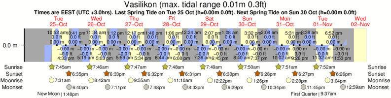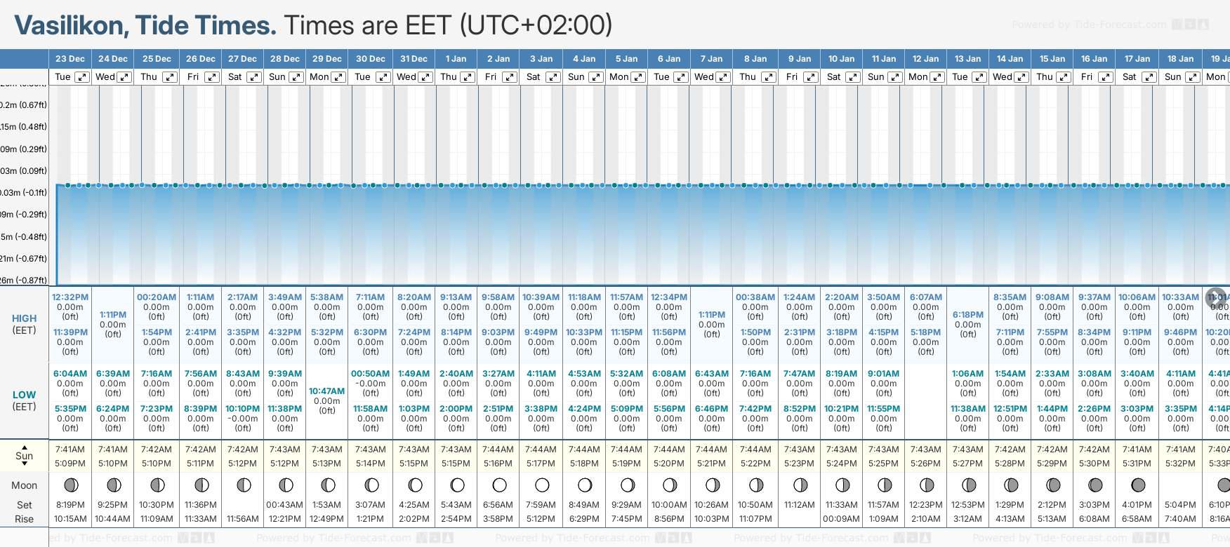 Tide Times are EET (UTC +2.0hrs). Last Spring High Tide at Vasilikon was on Sun 21 Dec (height: 0.00m 0.0ft). Next high Spring Tide at Vasilikon will be on Fri 26 Dec (height: 0.00m 0.0ft).