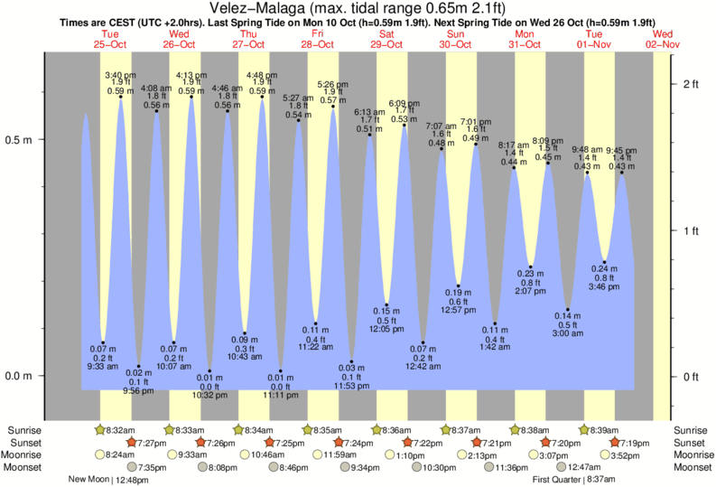 Tide Times are CET (UTC +1.0hrs). Last Spring High Tide at Velez-Malaga was on Fri 05 Dec (height: 0.60m 2.0ft). Next high Spring Tide at Velez-Malaga will be on Sun 21 Dec (height: 0.53m 1.7ft).