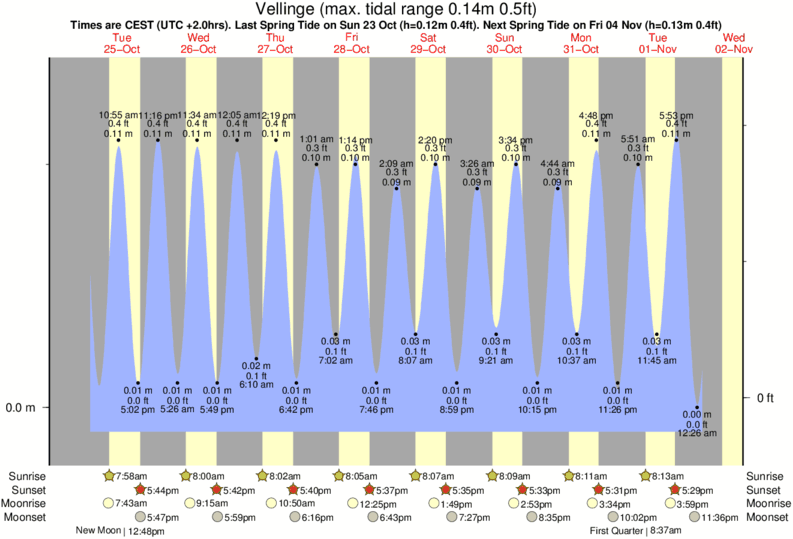 December and January Tide charts for Vellinge: The tide charts below show the height, time and date of high and low tides for the next 30 days.