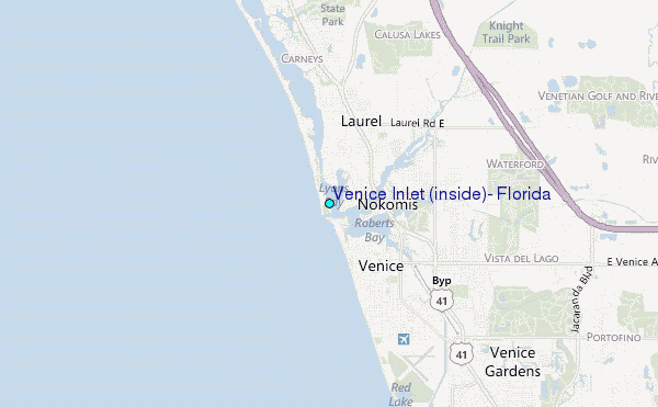 Use this relief map to navigate to tide stations, surf breaks and cities that are in the area of Venice Inlet (inside), Florida.