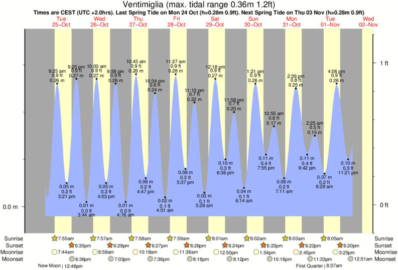 Tide chart for VentimigliaShowing low and high tide times for the next 30 days at Ventimiglia. Tide Times are CET (UTC +1.0hrs).