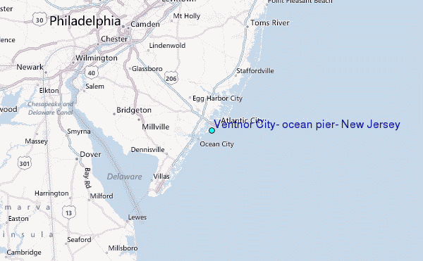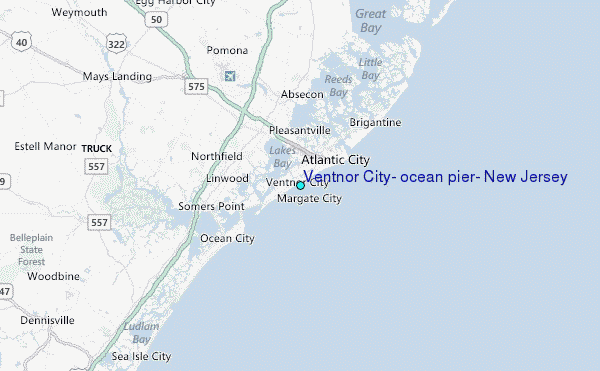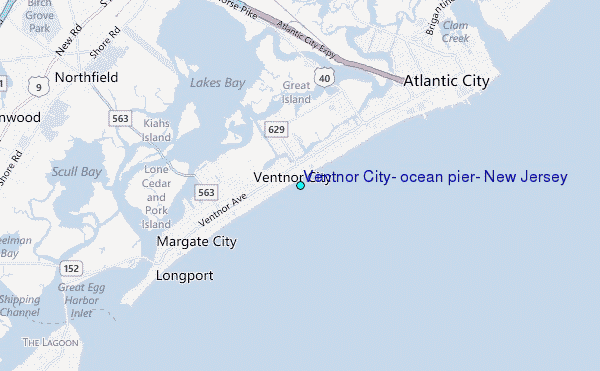 Use this relief map to navigate to tide stations, surf breaks and cities that are in the area of Ventnor City, ocean pier, New Jersey.