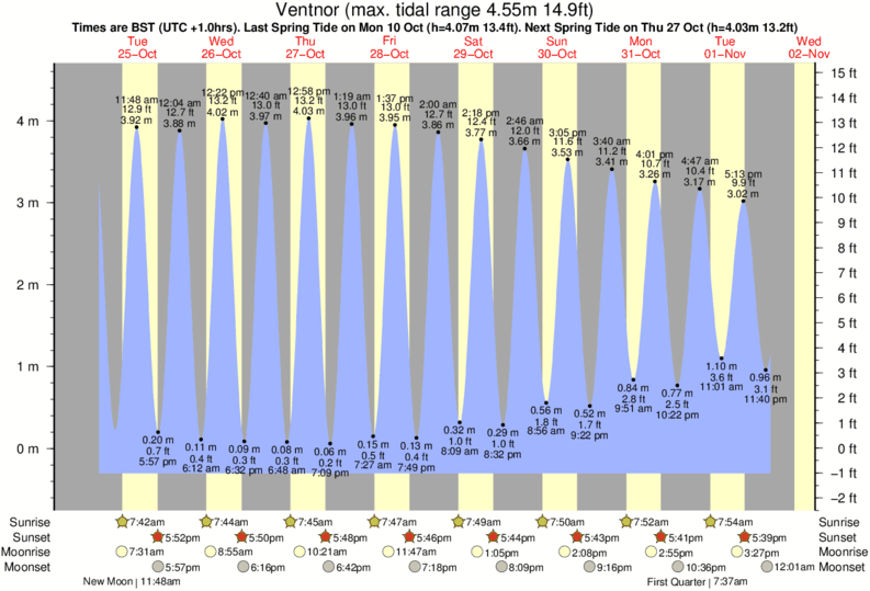 December and January Tide charts for Ventnor: The tide charts below show the height, time and date of high and low tides for the next 30 days.
