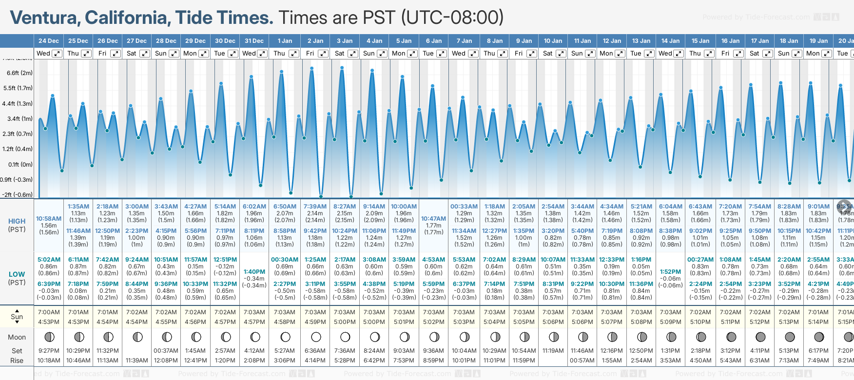 Tide chart for VenturaShowing low and high tide times for the next 30 days at Ventura. Tide Times are PST (UTC -8.0hrs).