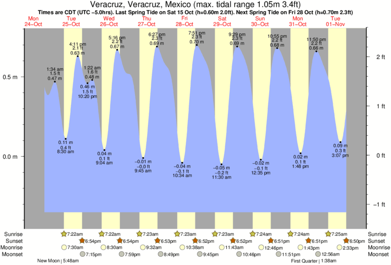 Tide Times are CST (UTC -6.0hrs). Last Spring High Tide at Veracruz was on Thu 04 Dec (height: 0.69m 2.3ft). Next high Spring Tide at Veracruz will be on Fri 19 Dec (height: 0.60m 2.0ft).