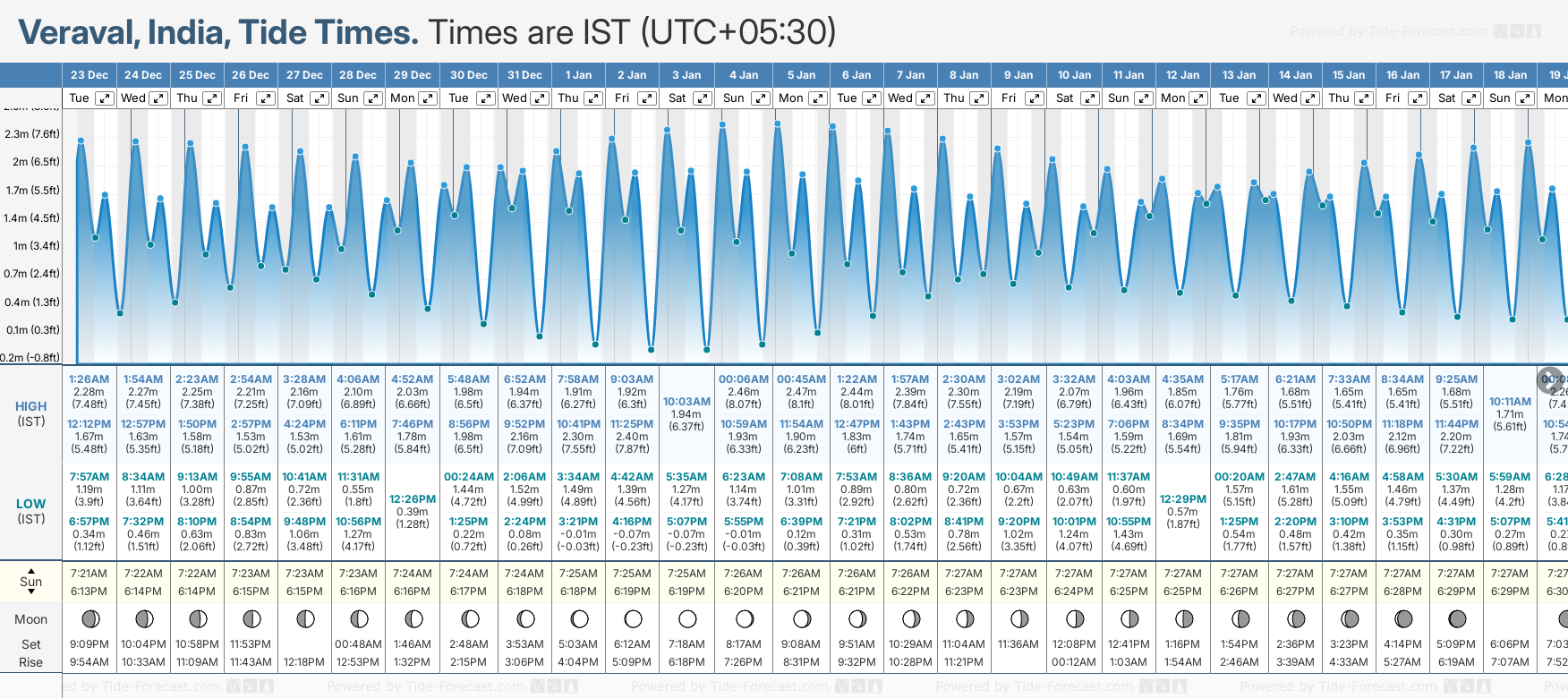 Tide chart for VeravalShowing low and high tide times for the next 30 days at Veraval. Tide Times are IST (UTC +5.5hrs).