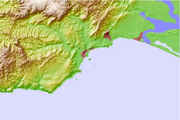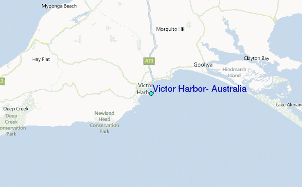 Use this relief map to navigate to tide stations, surf breaks and cities that are in the area of Victor Harbor, Australia.