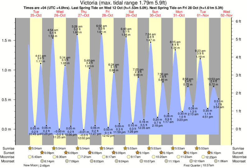 Tide Times are +04 (UTC +4.0hrs). Last Spring High Tide at Victoria was on Sat 06 Dec (height: 1.71m 5.6ft). Next high Spring Tide at Victoria will be on Mon 22 Dec (height: 1.43m 4.7ft).