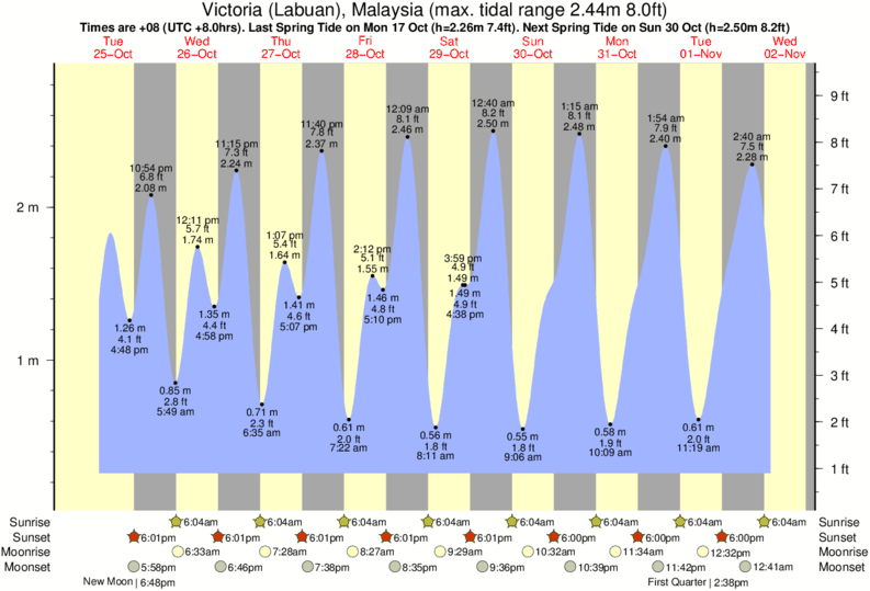 Tide Times are +08 (UTC +8.0hrs). Last Spring High Tide at Victoria (Labuan) was on Sun 07 Dec (height: 2.71m 8.9ft). Next high Spring Tide at Victoria (Labuan) will be on Tue 23 Dec (height: 2.56m 8.4ft).