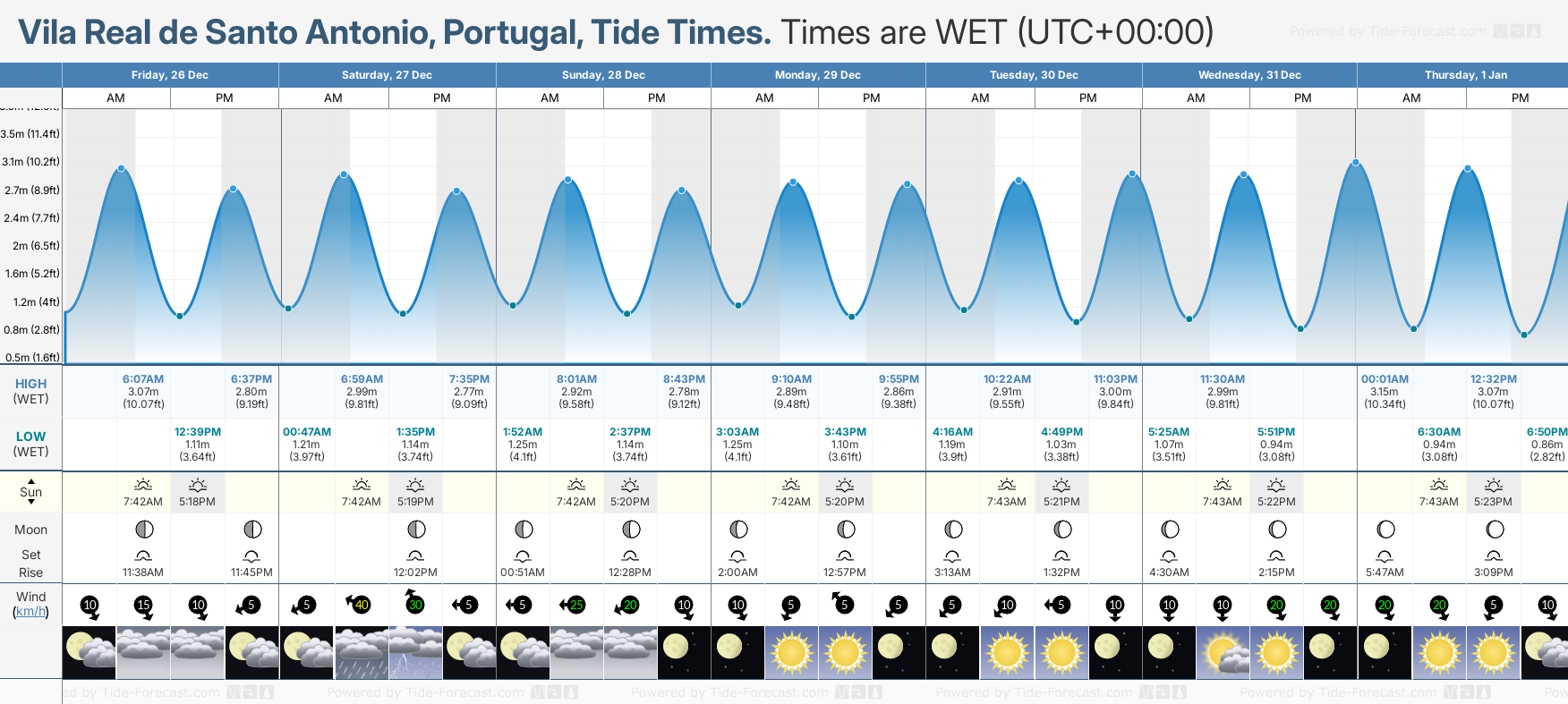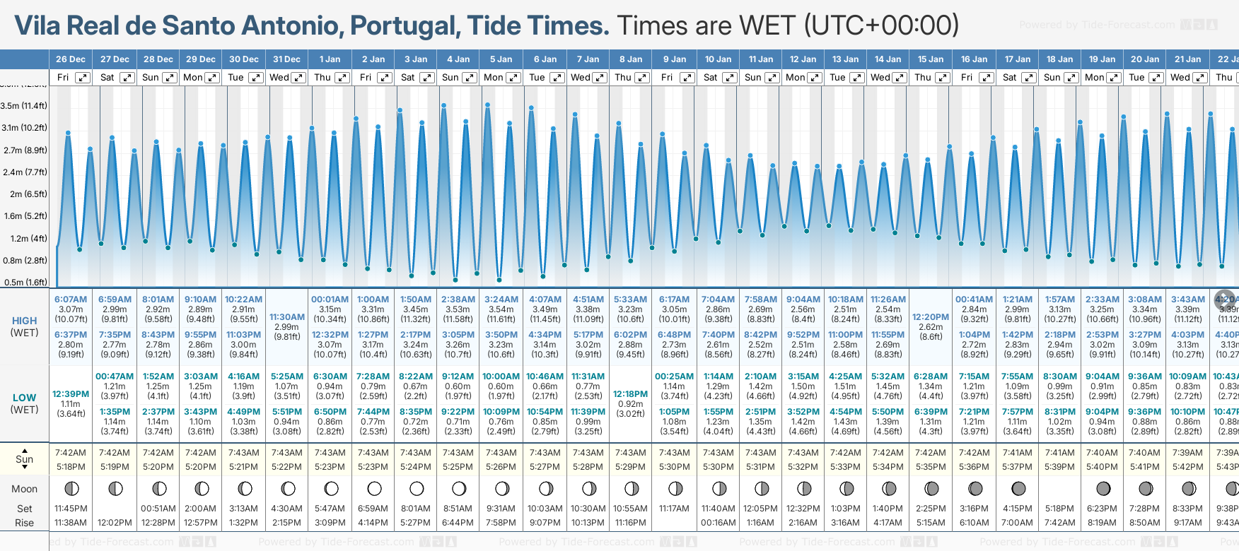 Tide chart for Vila Real de Santo AntonioShowing low and high tide times for the next 30 days at Vila Real de Santo Antonio. Tide Times are WET (UTC +0hrs).