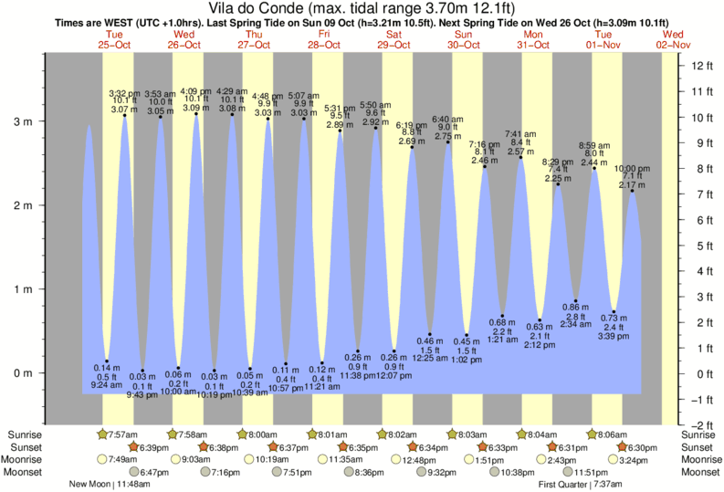 Tide Times are WET (UTC +0hrs). Last Spring High Tide at Vila do Conde was on Sat 06 Dec (height: 3.21m 10.5ft). Next high Spring Tide at Vila do Conde will be on Mon 22 Dec (height: 2.81m 9.2ft).