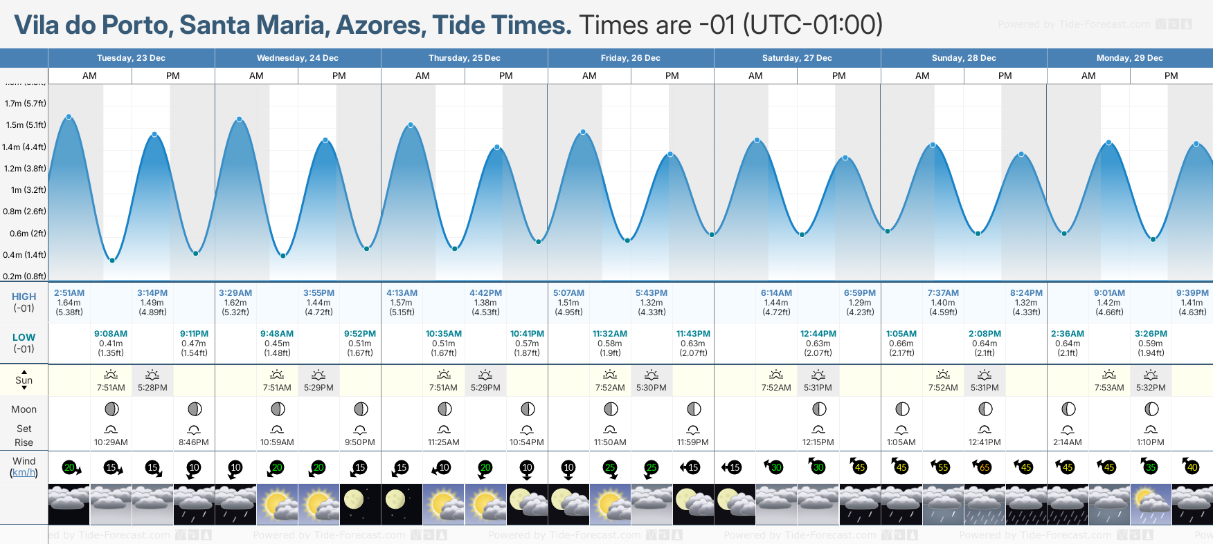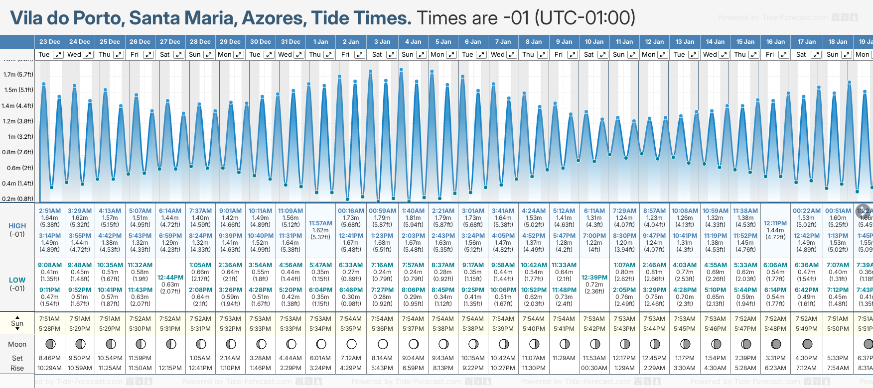 Tide Times are -01 (UTC -1.0hrs). Last Spring High Tide at Vila do Porto, Santa Maria was on Tue 23 Dec (height: 1.64m 5.4ft). Next high Spring Tide at Vila do Porto, Santa Maria will be on Sun 04 Jan (height: 1.81m 5.9ft).