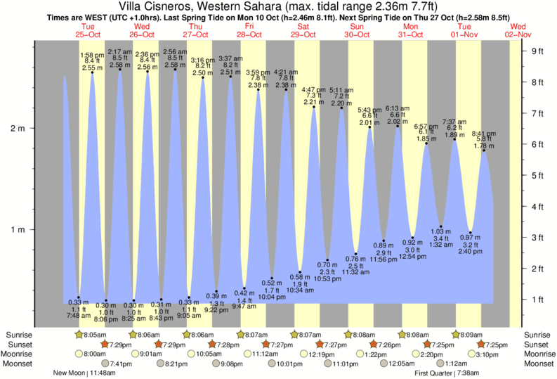 Tide Times are +01 (UTC +1.0hrs). Last Spring High Tide at Villa Cisneros was on Fri 05 Dec (height: 2.52m 8.3ft). Next high Spring Tide at Villa Cisneros will be on Tue 23 Dec (height: 2.34m 7.7ft).