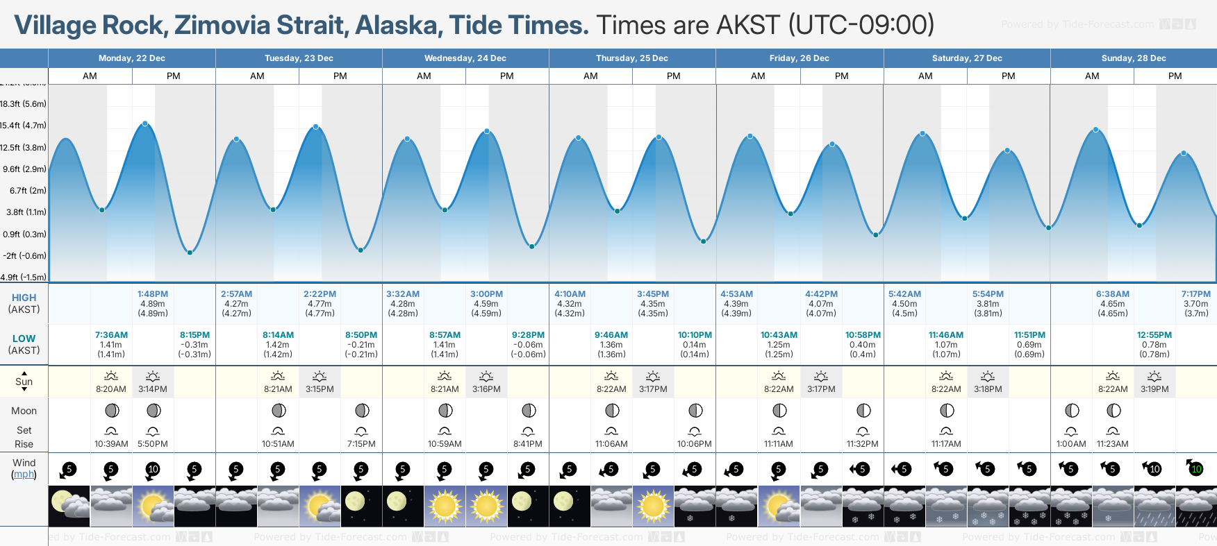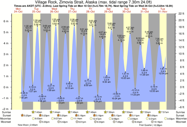 Tide Times are AKST (UTC -9.0hrs). Last Spring High Tide at Village Rock, Zimovia Strait was on Fri 19 Dec (height: 5.04m 16.5ft). Next high Spring Tide at Village Rock, Zimovia Strait will be on Sat 03 Jan (height: 5.91m 19.4ft).