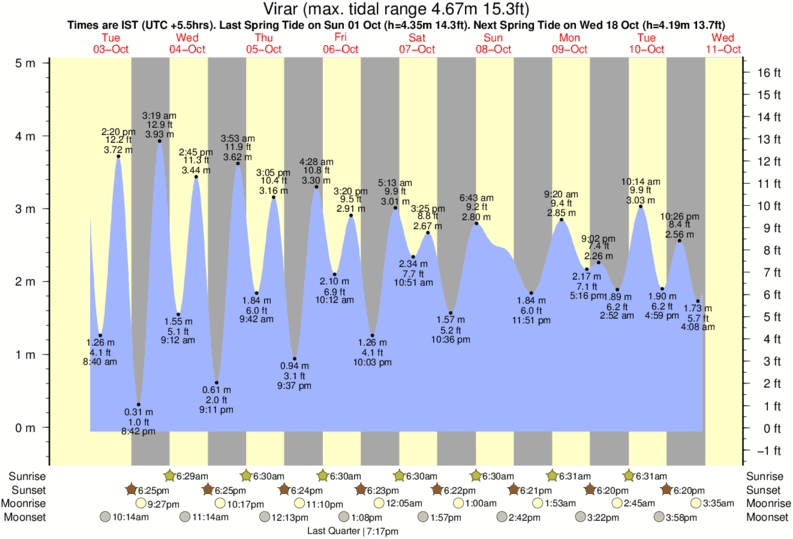Tide Times are IST (UTC +5.5hrs). Last Spring High Tide at Virar was on Sat 06 Dec (height: 4.59m 15.1ft). Next high Spring Tide at Virar will be on Wed 24 Dec (height: 4.05m 13.3ft).