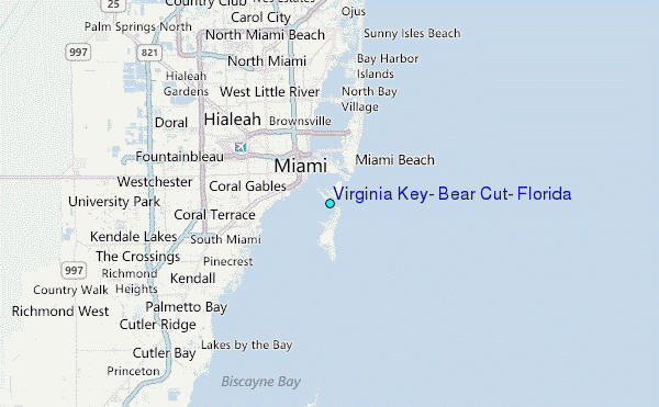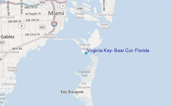 Use this relief map to navigate to tide stations, surf breaks and cities that are in the area of Virginia Key, Bear Cut, Florida.