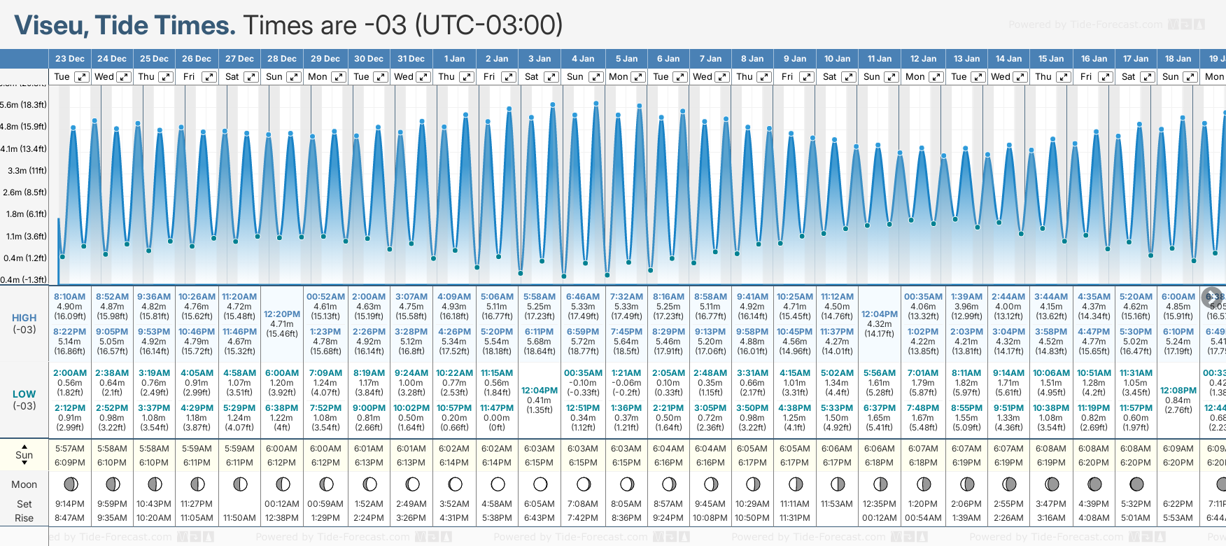 Tide Times are -03 (UTC -3.0hrs). Last Spring High Tide at Viseu was on Sun 21 Dec (height: 5.19m 17.0ft). Next high Spring Tide at Viseu will be on Sun 04 Jan (height: 5.72m 18.8ft).