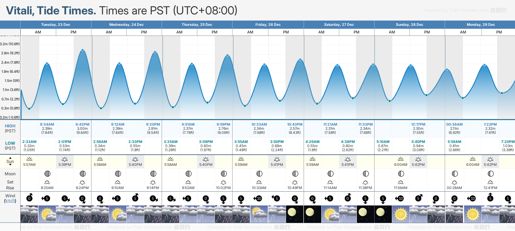 Tide Times are PST (UTC +8.0hrs). Last Spring High Tide at Vitali was on Sun 07 Dec (height: 3.38m 11.1ft). Next high Spring Tide at Vitali will be on Tue 23 Dec (height: 3.04m 10.0ft).