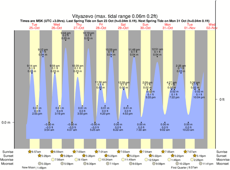 Tide Times are MSK (UTC +3.0hrs). Last Spring High Tide at Vityazevo was on Thu 18 Dec (height: 0.04m 0.1ft). Next high Spring Tide at Vityazevo will be on Wed 24 Dec (height: 0.04m 0.1ft).