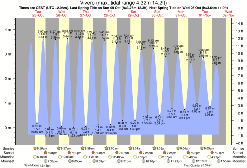 Tide Times are CET (UTC +1.0hrs). Last Spring High Tide at Vivero was on Sat 06 Dec (height: 3.75m 12.3ft). Next high Spring Tide at Vivero will be on Mon 22 Dec (height: 3.28m 10.8ft).