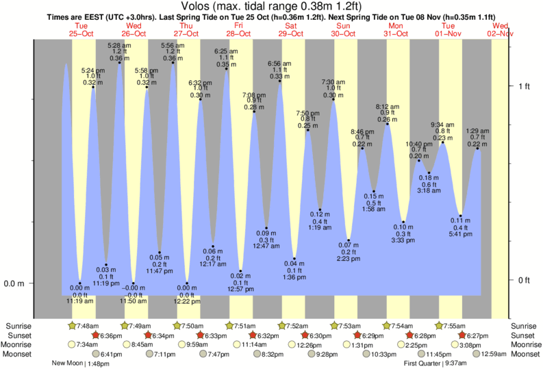 Tide Times are EET (UTC +2.0hrs). Last Spring High Tide at Volos was on Sat 06 Dec (height: 0.35m 1.1ft). Next high Spring Tide at Volos will be on Sun 21 Dec (height: 0.33m 1.1ft).
