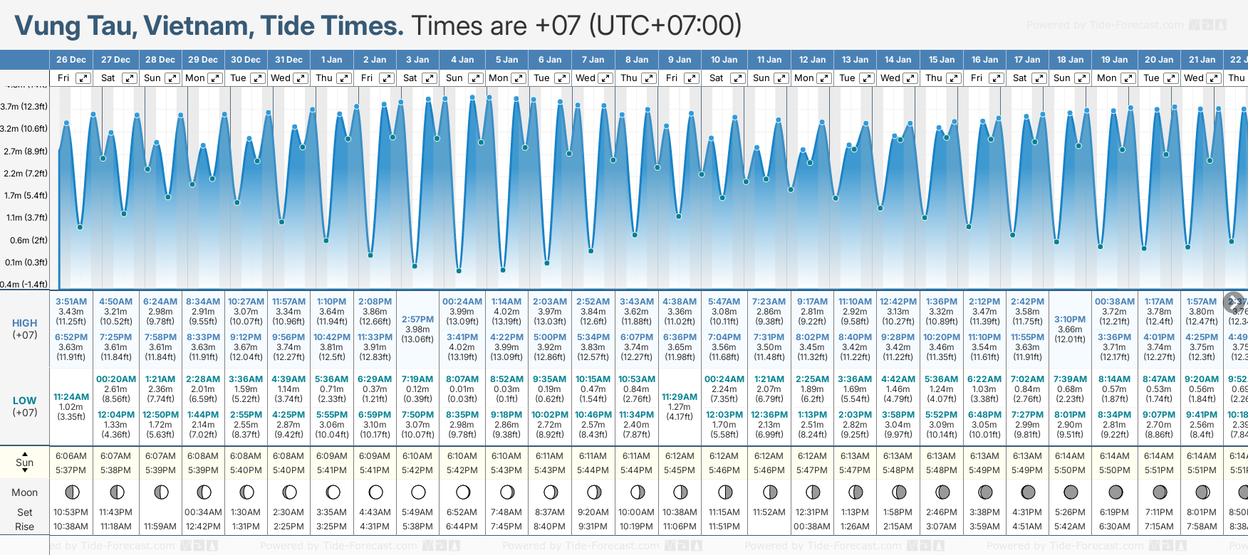 December and January Tide charts for Vung Tau: The tide charts below show the height, time and date of high and low tides for the next 30 days.