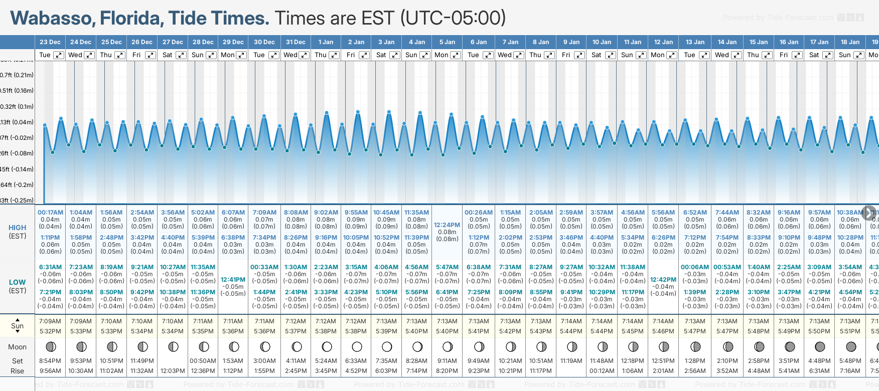 Tide Times are EST (UTC -5.0hrs). Last Spring High Tide at Wabasso was on Sun 21 Dec (height: 0.07m 0.2ft). Next high Spring Tide at Wabasso will be on Fri 02 Jan (height: 0.09m 0.3ft).