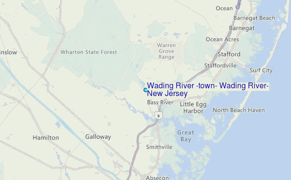 Use this relief map to navigate to tide stations, surf breaks and cities that are in the area of Wading River (town), Wading River, New Jersey.