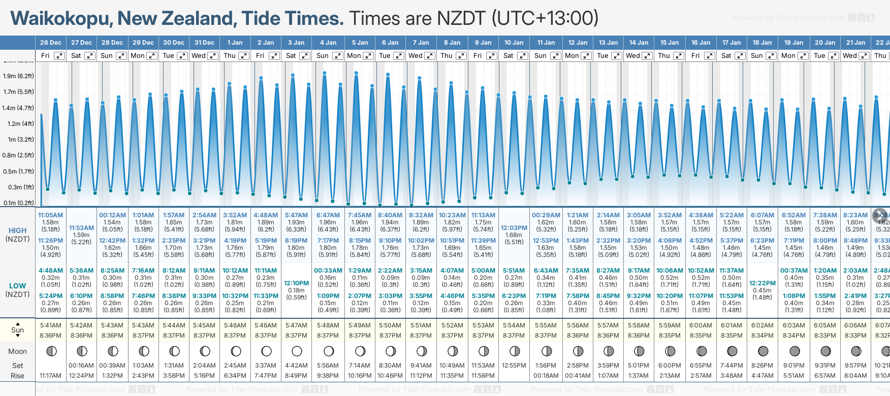 December and January Tide charts for Waikokopu: The tide charts below show the height, time and date of high and low tides for the next 30 days.
