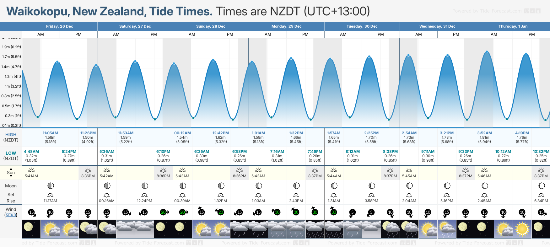 Tide Times are NZDT (UTC +13.0hrs). Last Spring High Tide at Waikokopu was on Mon 22 Dec (height: 1.62m 5.3ft). Next high Spring Tide at Waikokopu will be on Sun 04 Jan (height: 1.96m 6.4ft).