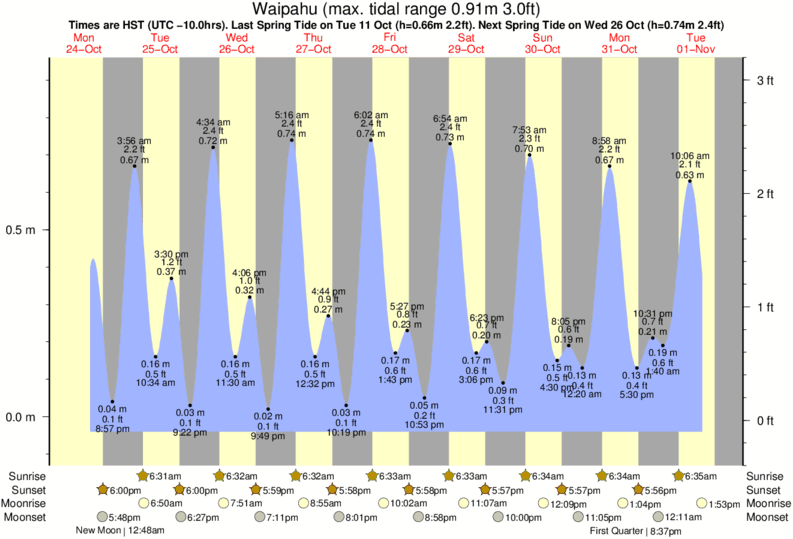 Tide Times are HST (UTC -10.0hrs). Last Spring High Tide at Waipahu was on Thu 04 Dec (height: 0.87m 2.9ft). Next high Spring Tide at Waipahu will be on Thu 01 Jan (height: 0.86m 2.8ft).