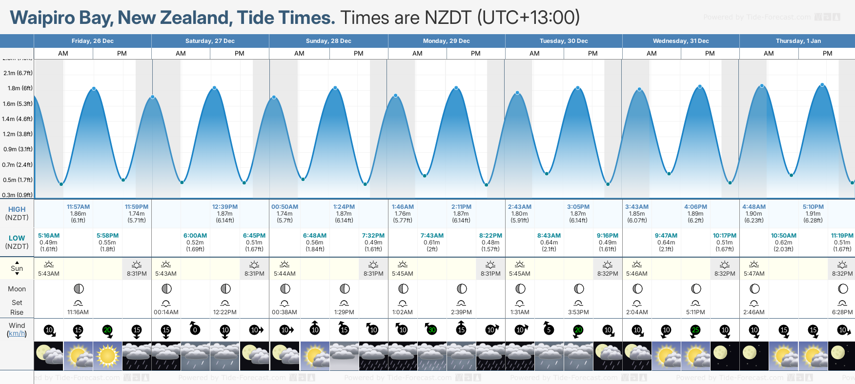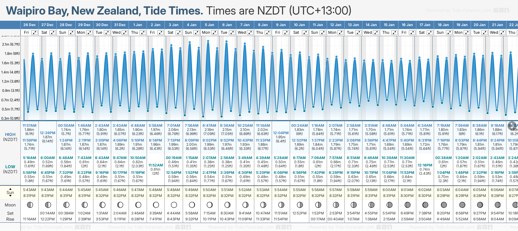 December and January Tide charts for Waipiro Bay: The tide charts below show the height, time and date of high and low tides for the next 30 days.