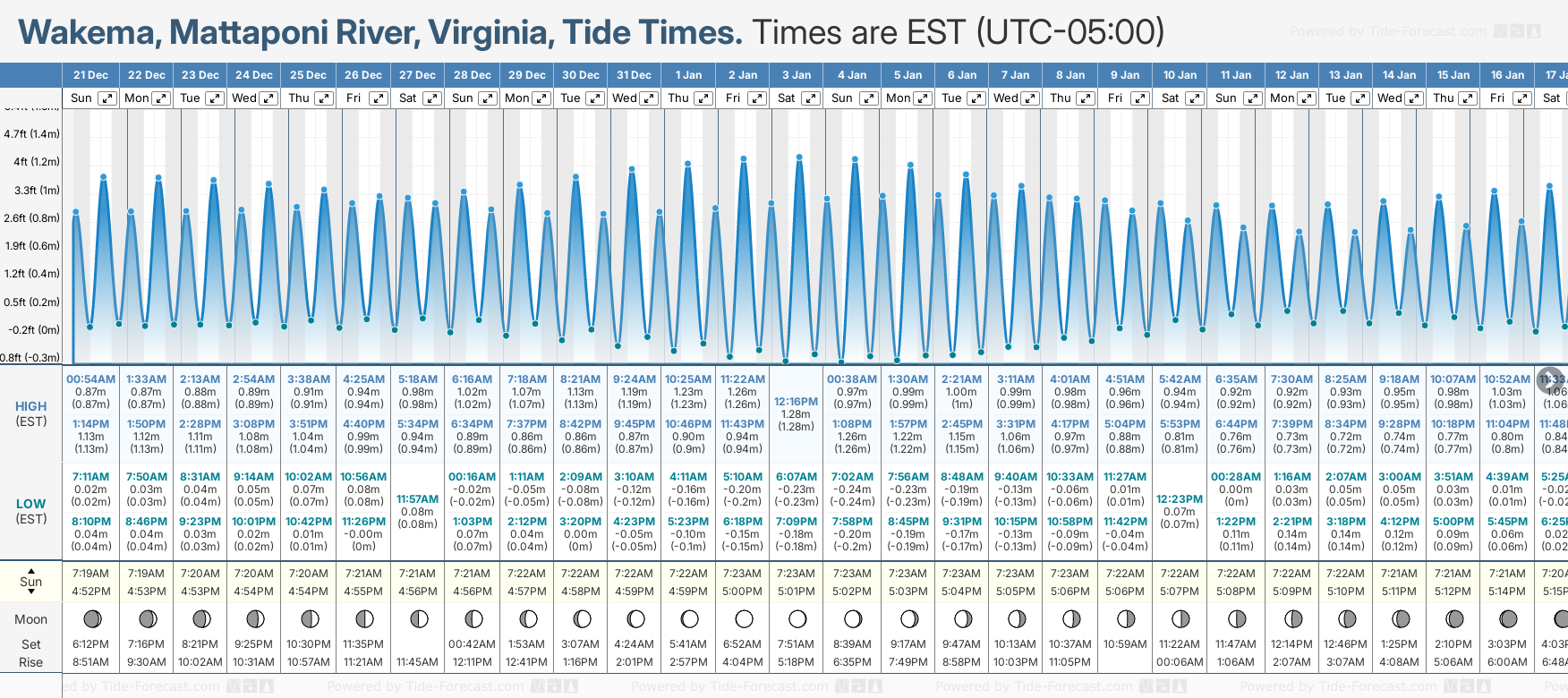 December and January Tide charts for Wakema, Mattaponi River: The tide charts below show the height, time and date of high and low tides for the next 30 days.