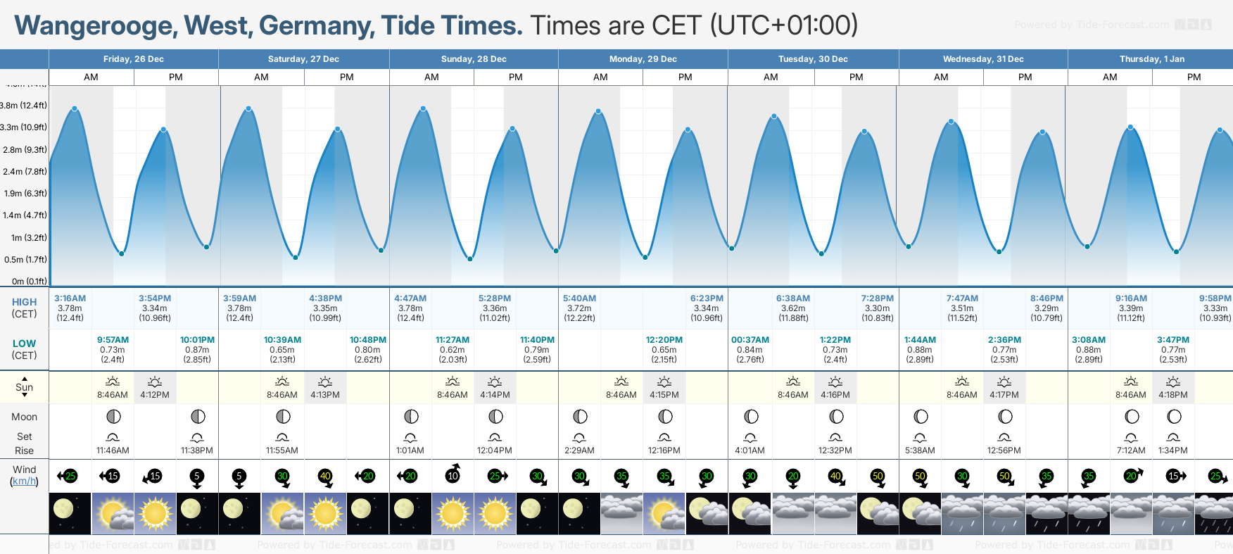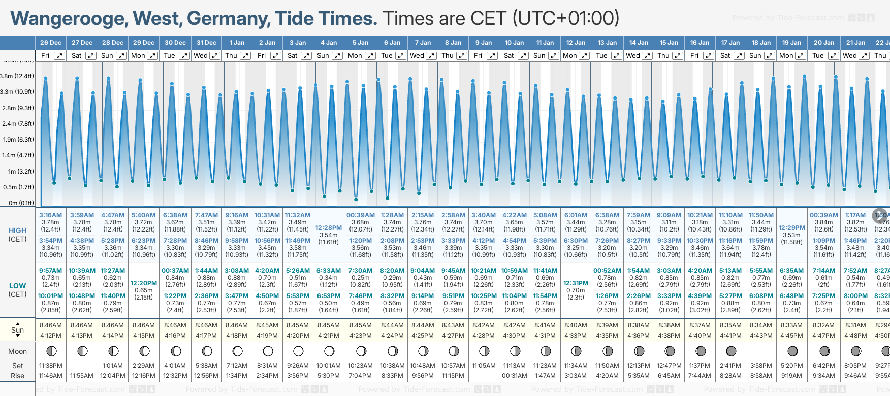 December and January Tide charts for Wangerooge, West: The tide charts below show the height, time and date of high and low tides for the next 30 days.