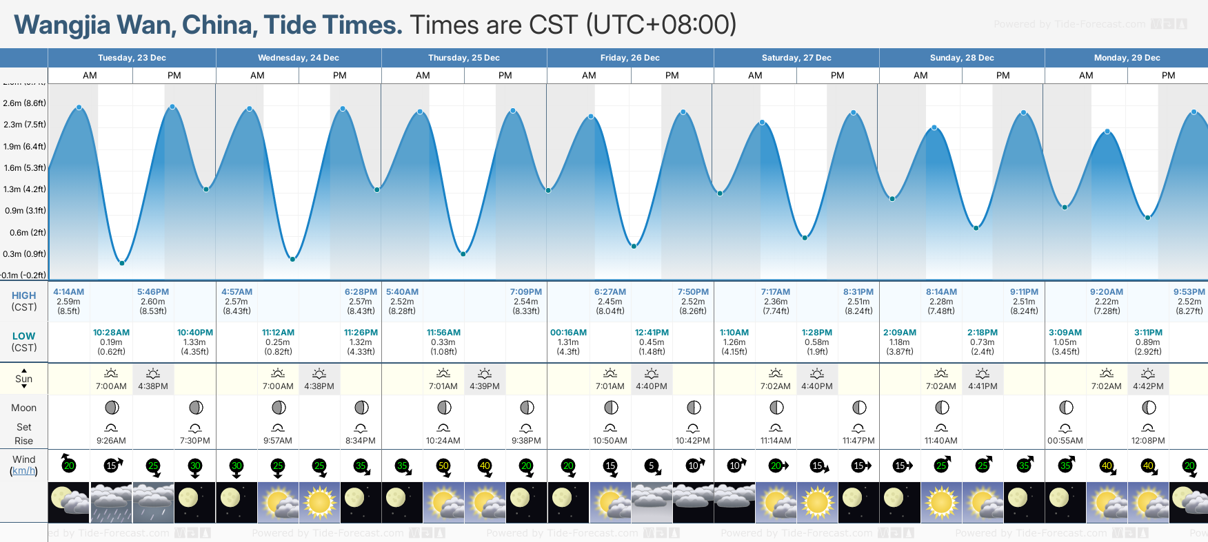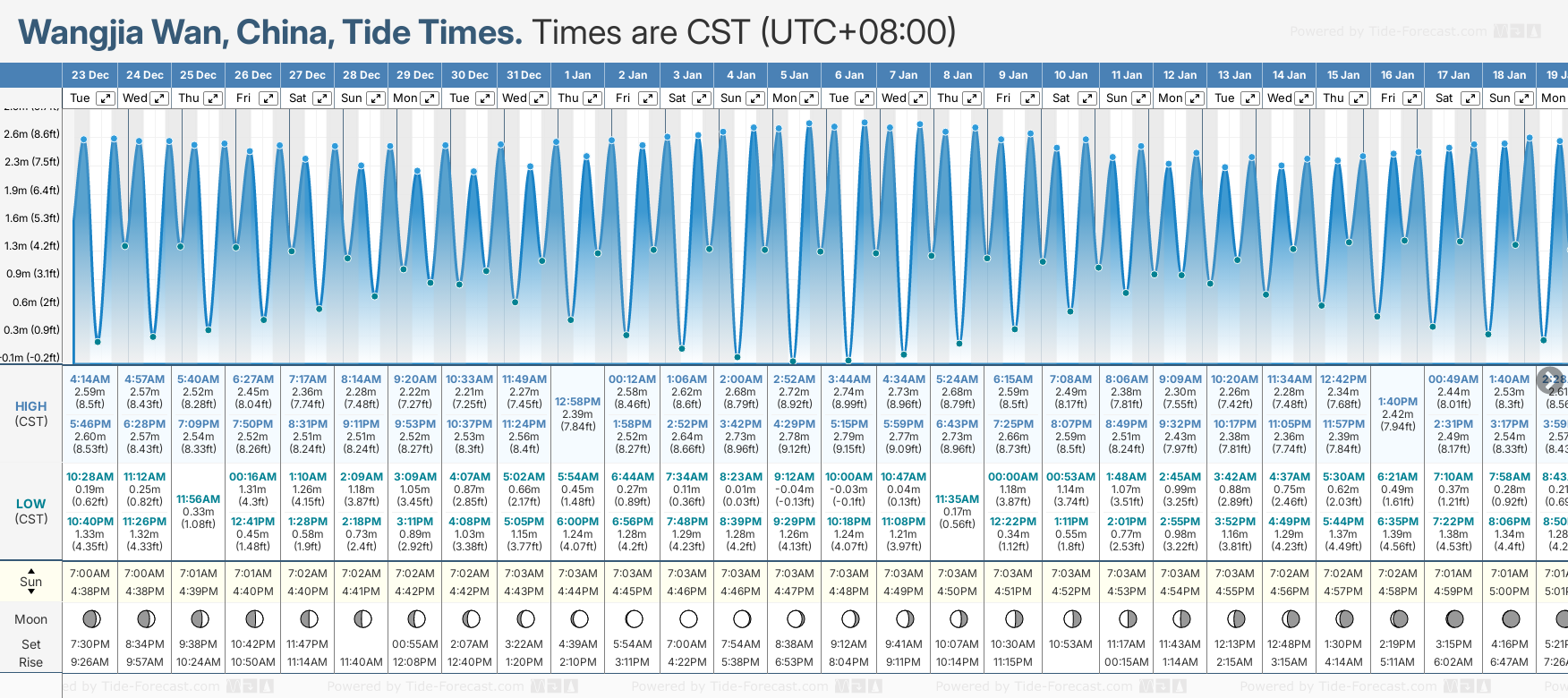 December and January Tide charts for Wangjia Wan: The tide charts below show the height, time and date of high and low tides for the next 30 days.