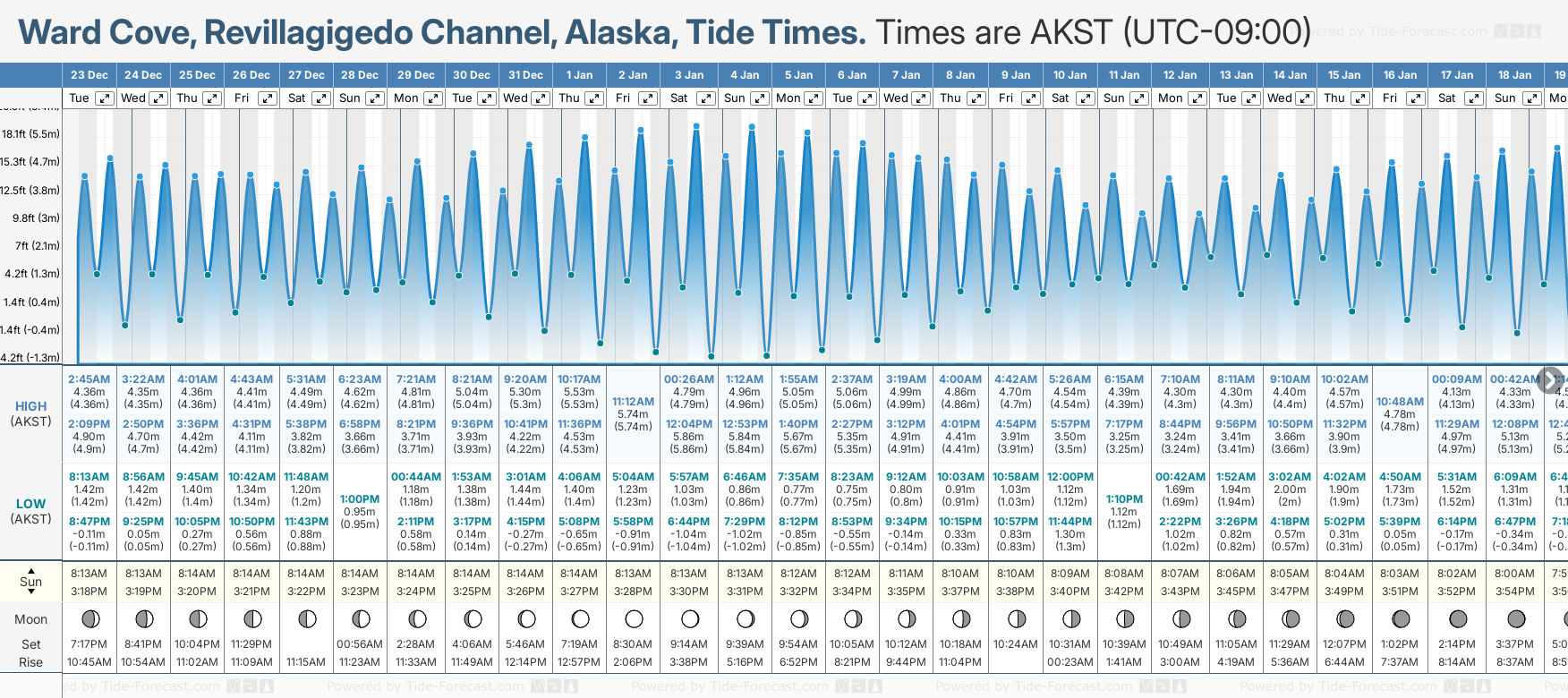 Tide Times are AKST (UTC -9.0hrs). Last Spring High Tide at Ward Cove, Revillagigedo Channel was on Sun 21 Dec (height: 5.10m 16.7ft). Next high Spring Tide at Ward Cove, Revillagigedo Channel will be on Sat 03 Jan (height: 5.86m 19.2ft).