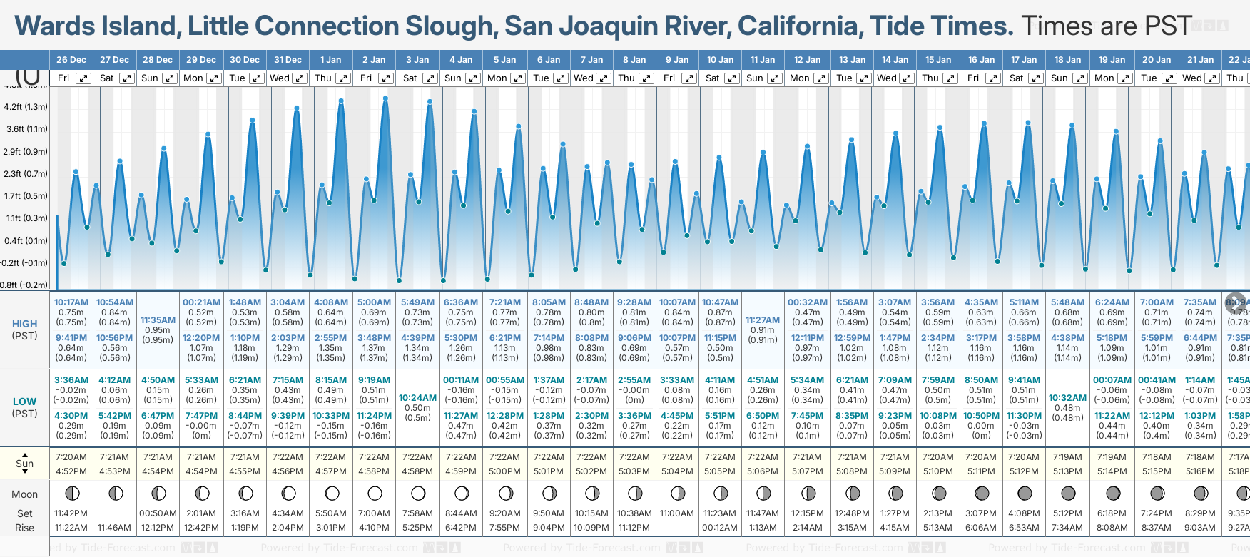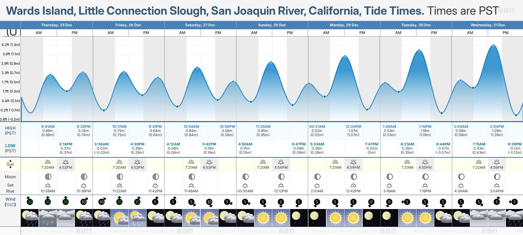 December and January Tide charts for Wards Island, Little Connection Slough, San Joaquin River: The tide charts below show the height, time and date of high and low tides for the next 30 days.