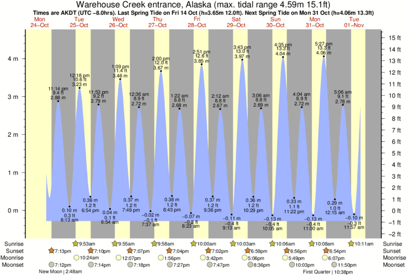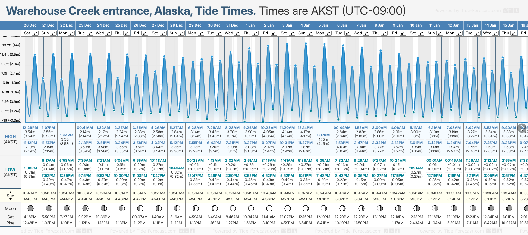 Tide chart for Warehouse Creek entranceShowing low and high tide times for the next 30 days at Warehouse Creek entrance. Tide Times are AKST (UTC -9.0hrs).